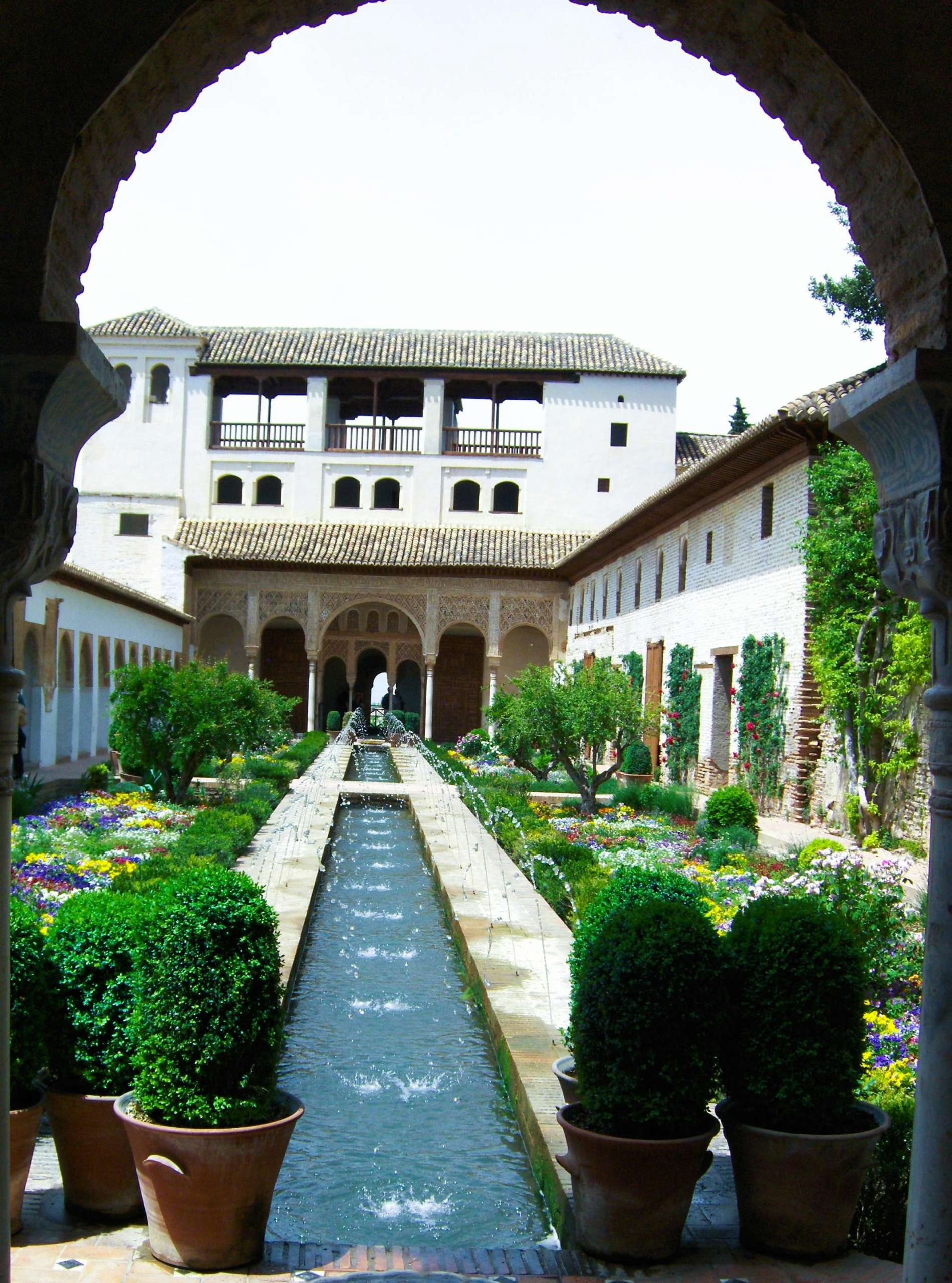 Un delicado canal de agua recorre el patio como un espejo en movimiento, mientras los surtidores dibujan arcos cristalinos que brillan al sol. El aroma de las flores, el sonido relajante del agua y la perfecta simetría de sus jardines crean una atmósfera mágica que envuelve a cada visitante.